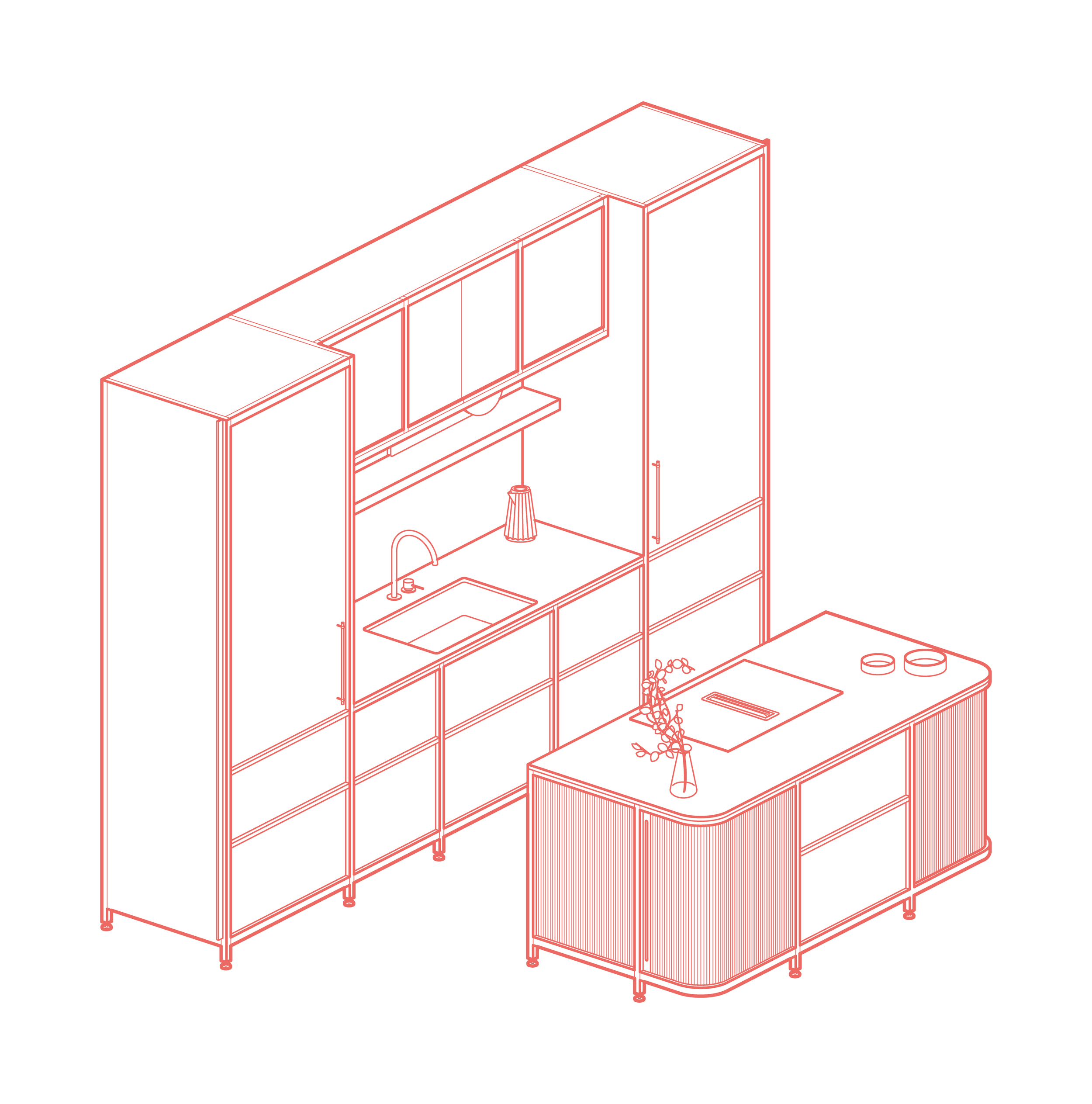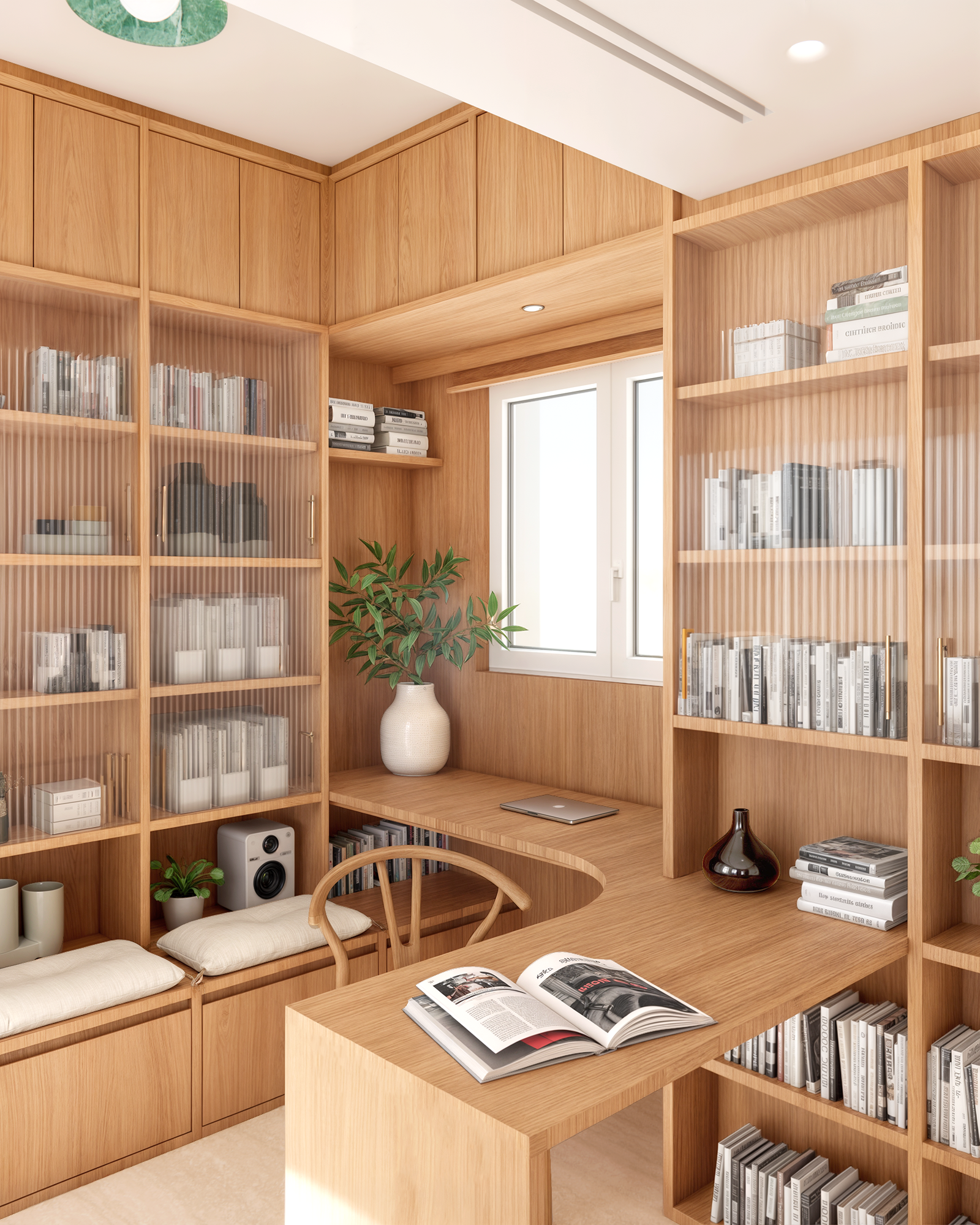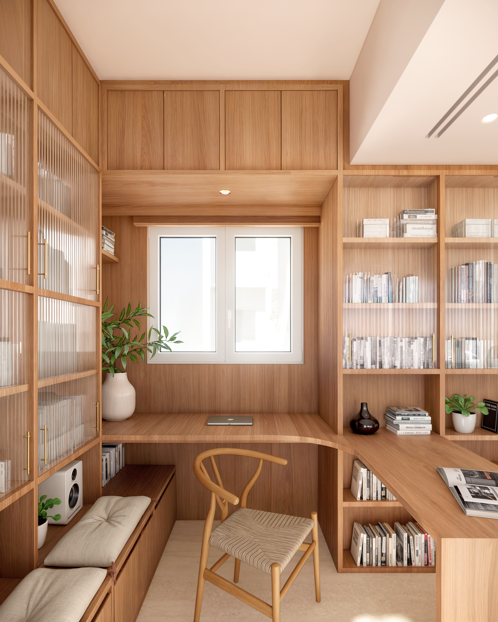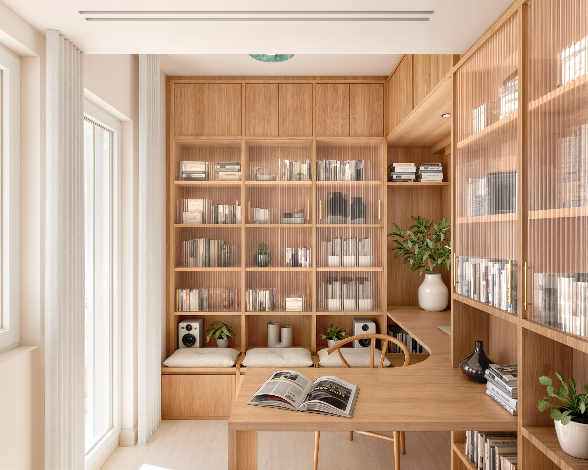 Key spaces carry distinct identities while belonging to a coherent whole. In the living room, a sculptural oak wall extends across the ceiling, contrasted by an exposed concrete beam that underscores the dialogue between raw and refined surfaces. The oak-lined study, bathed in daylight from four windows, is paired with a travertine-clad bathroom. In the main bathroom, monolithic marble volumes inspired by natural stone formations balance brutalist solidity with contemporary refinement, offering a tactile focal point to the private zone.