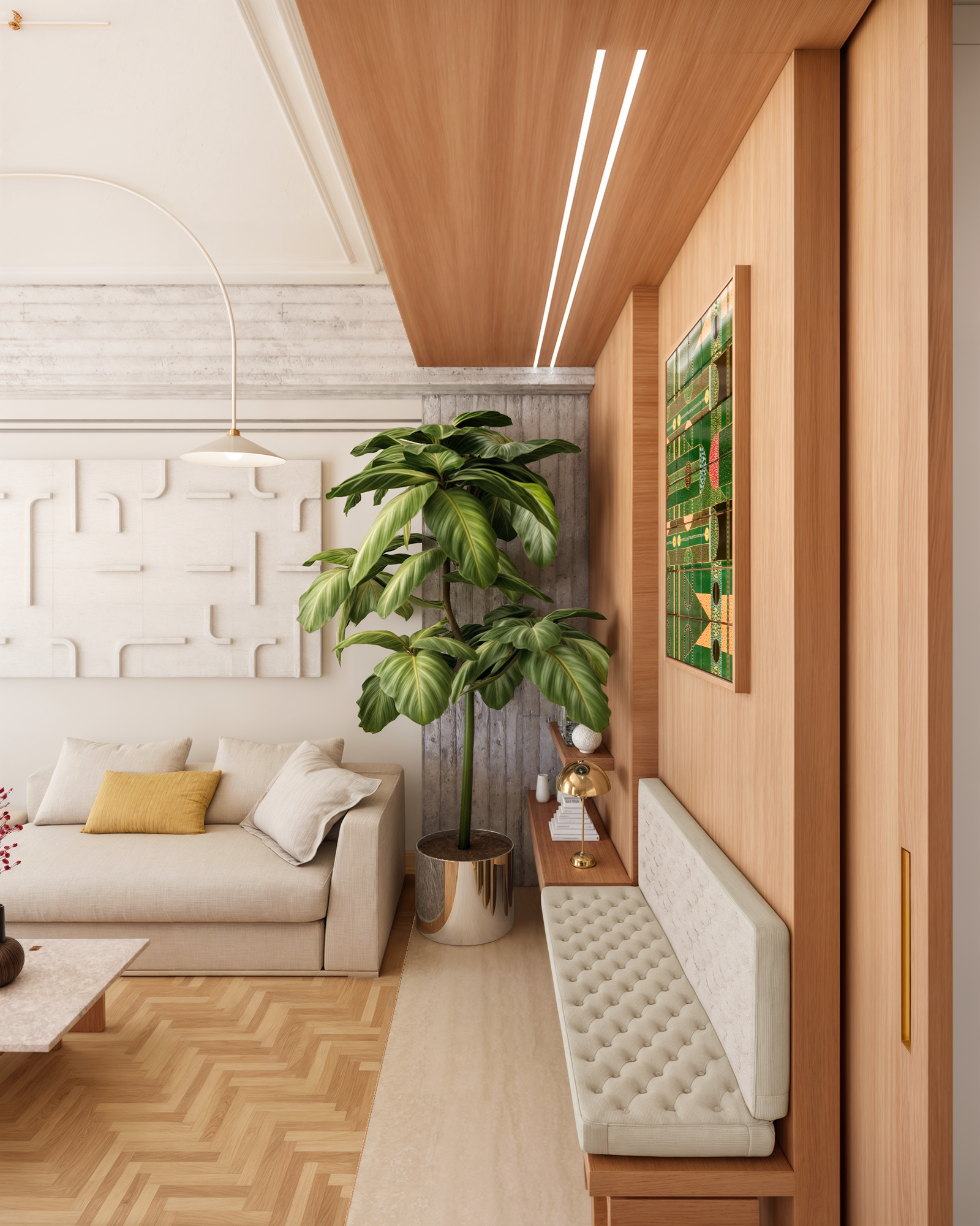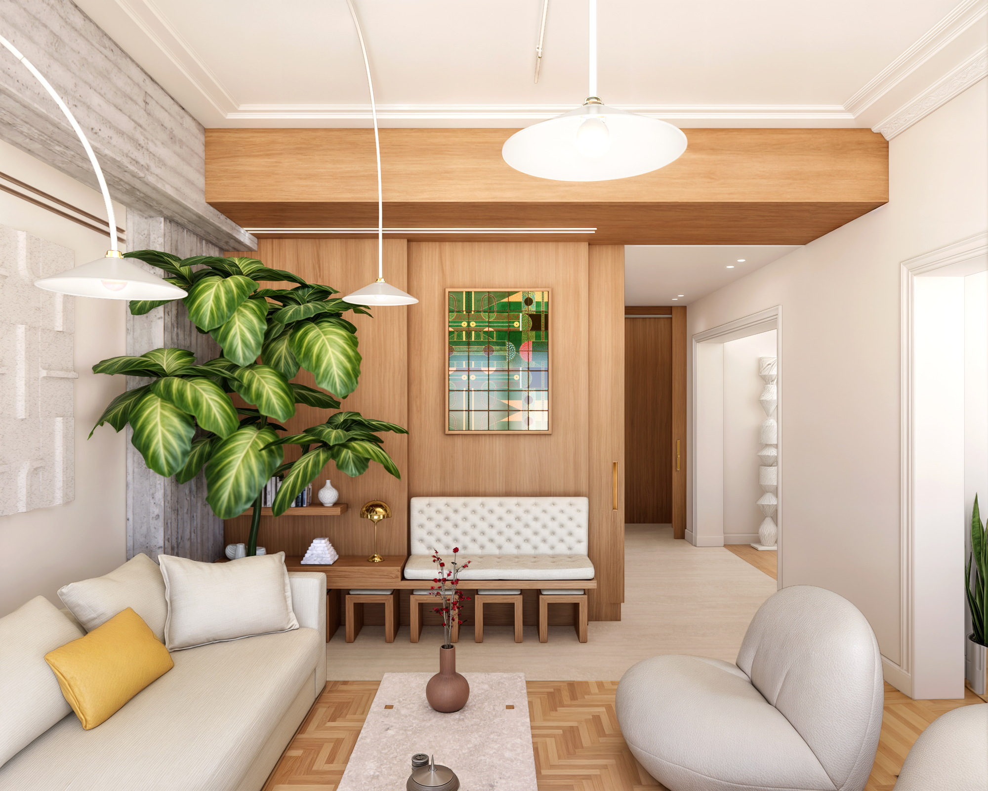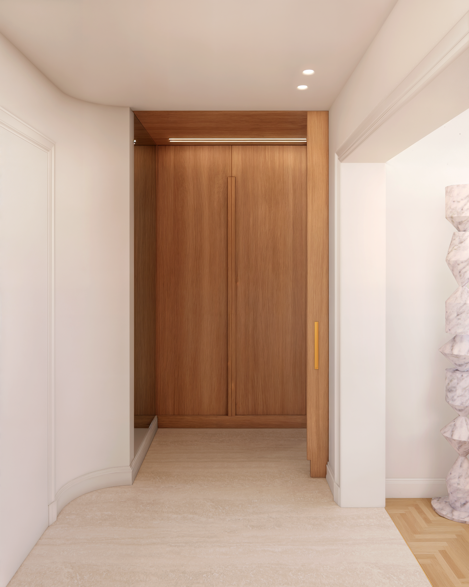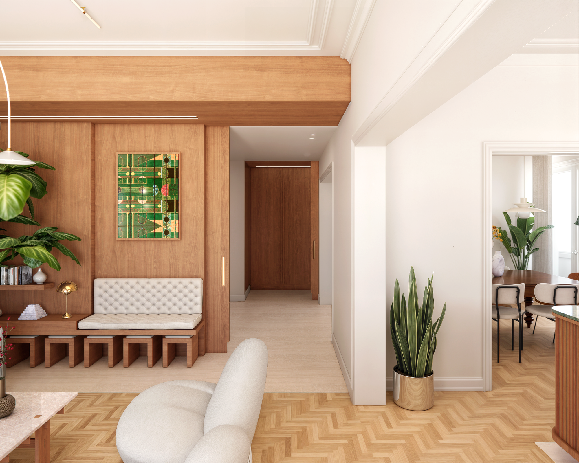 "Mid-century apartment, reimagined through marble, oak, and light into discreet sophistication."