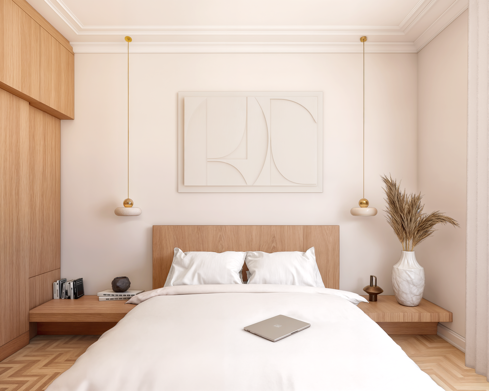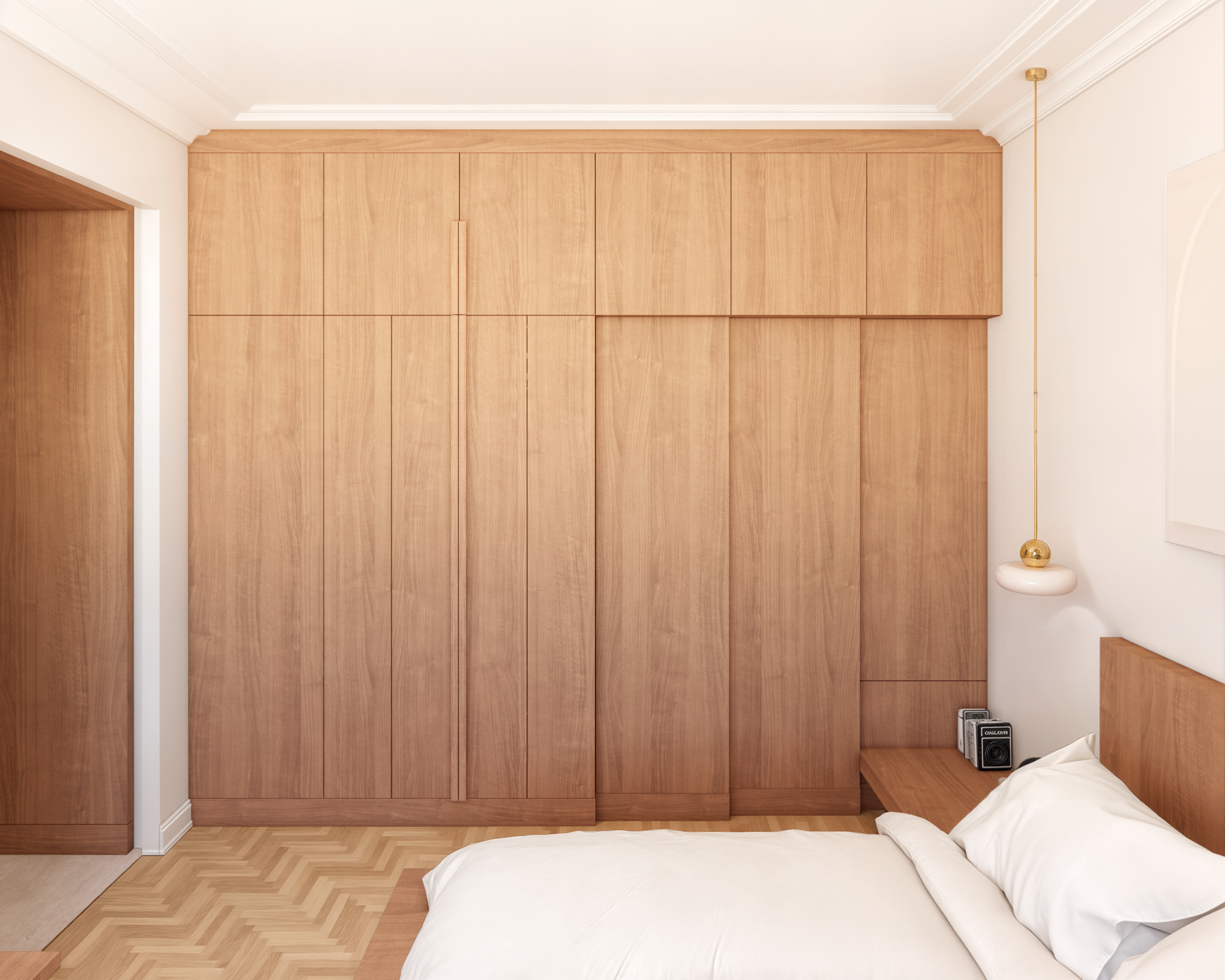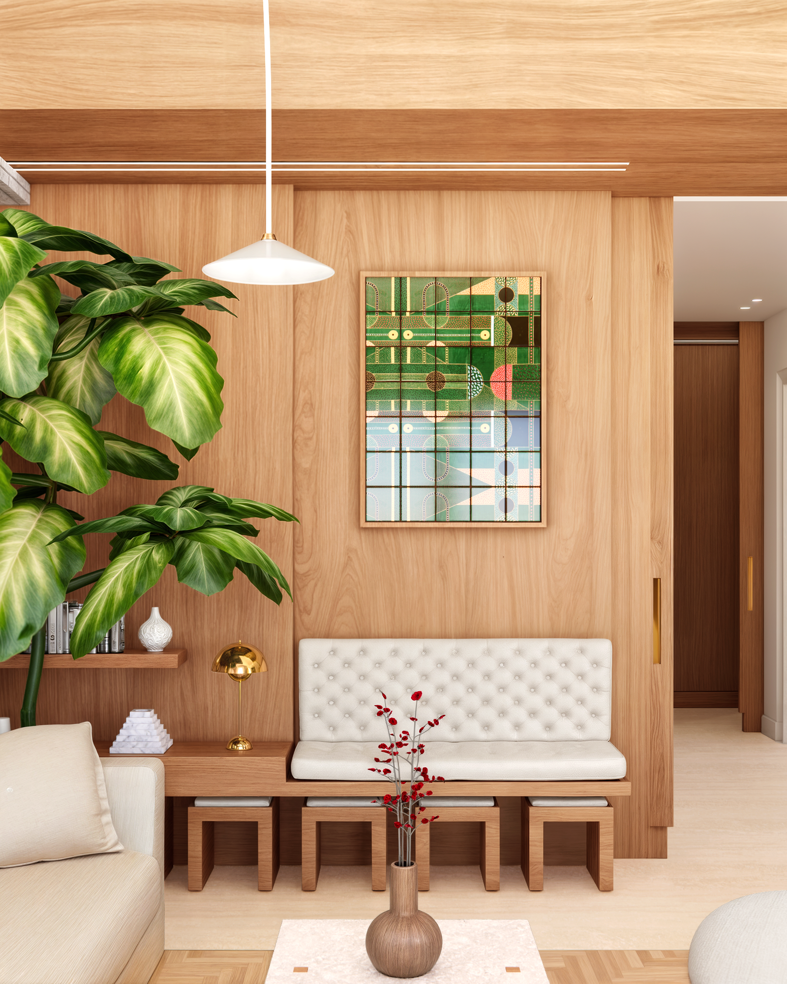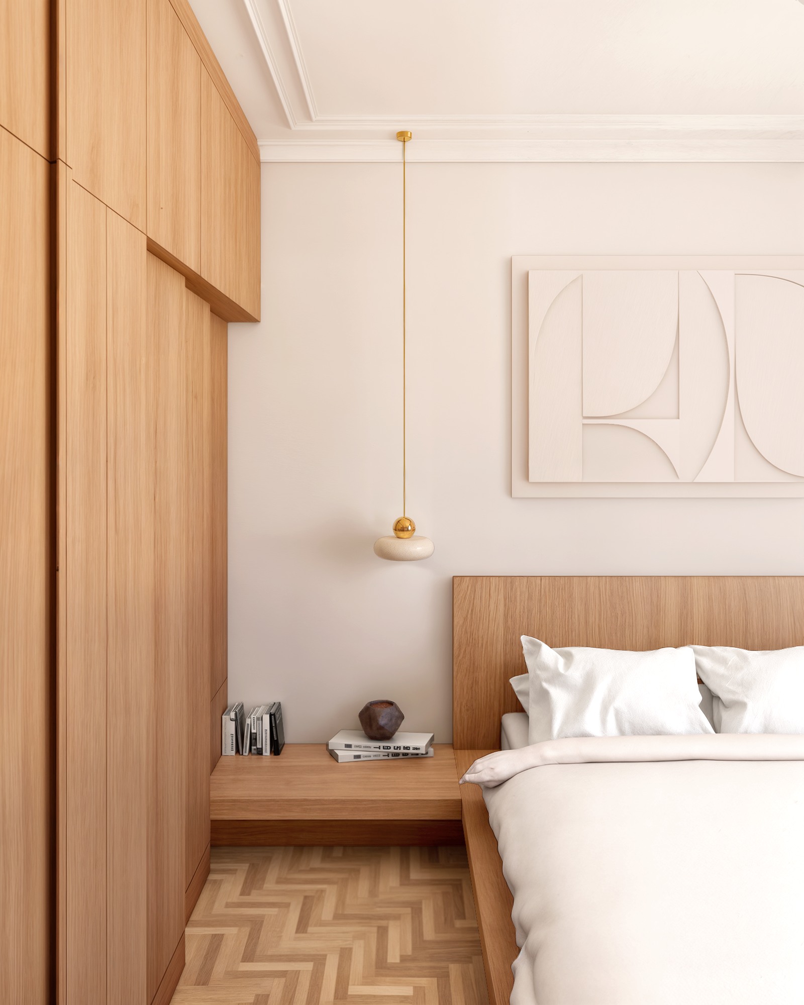 "Mid-century apartment, reimagined through marble, oak, and light into discreet sophistication."