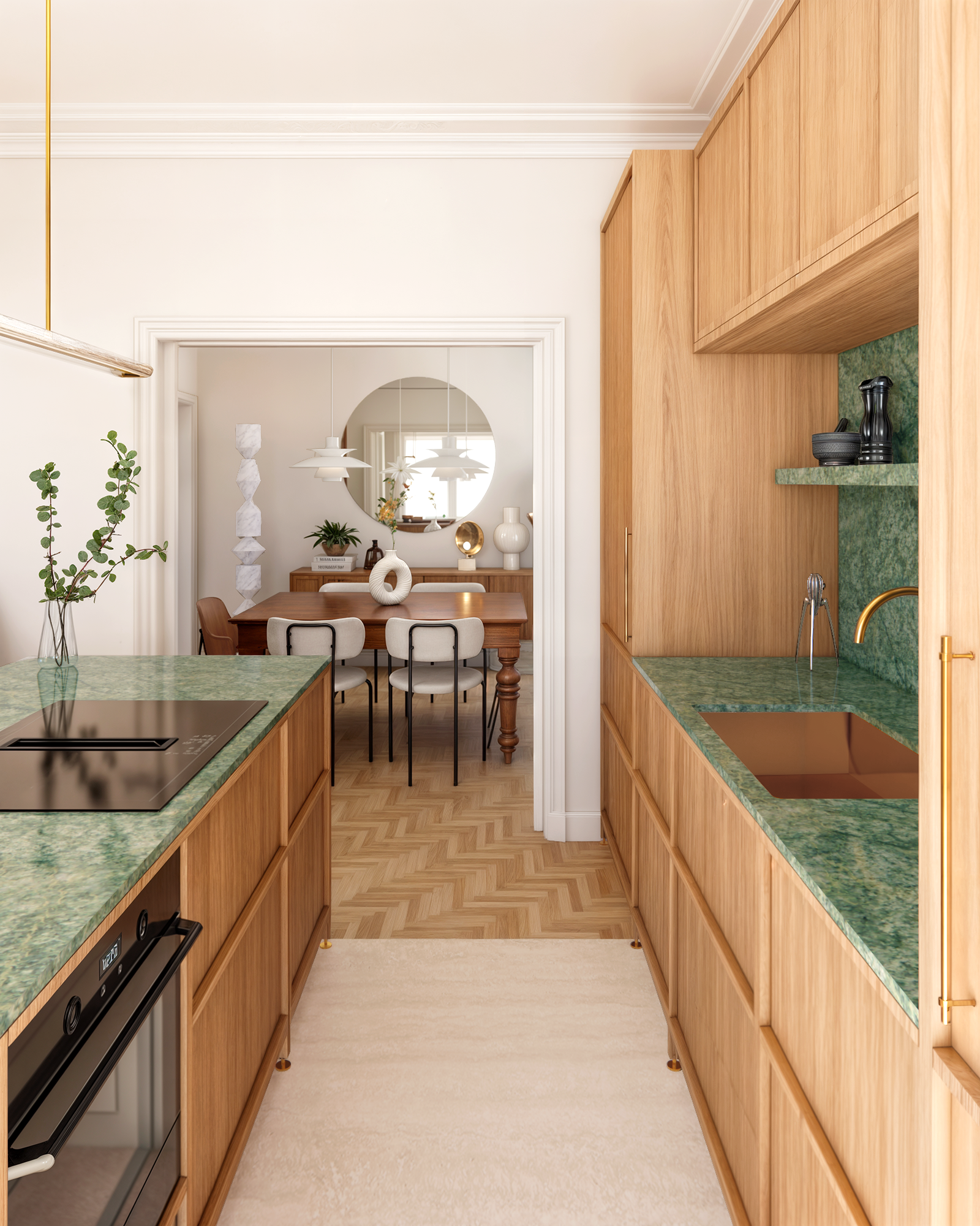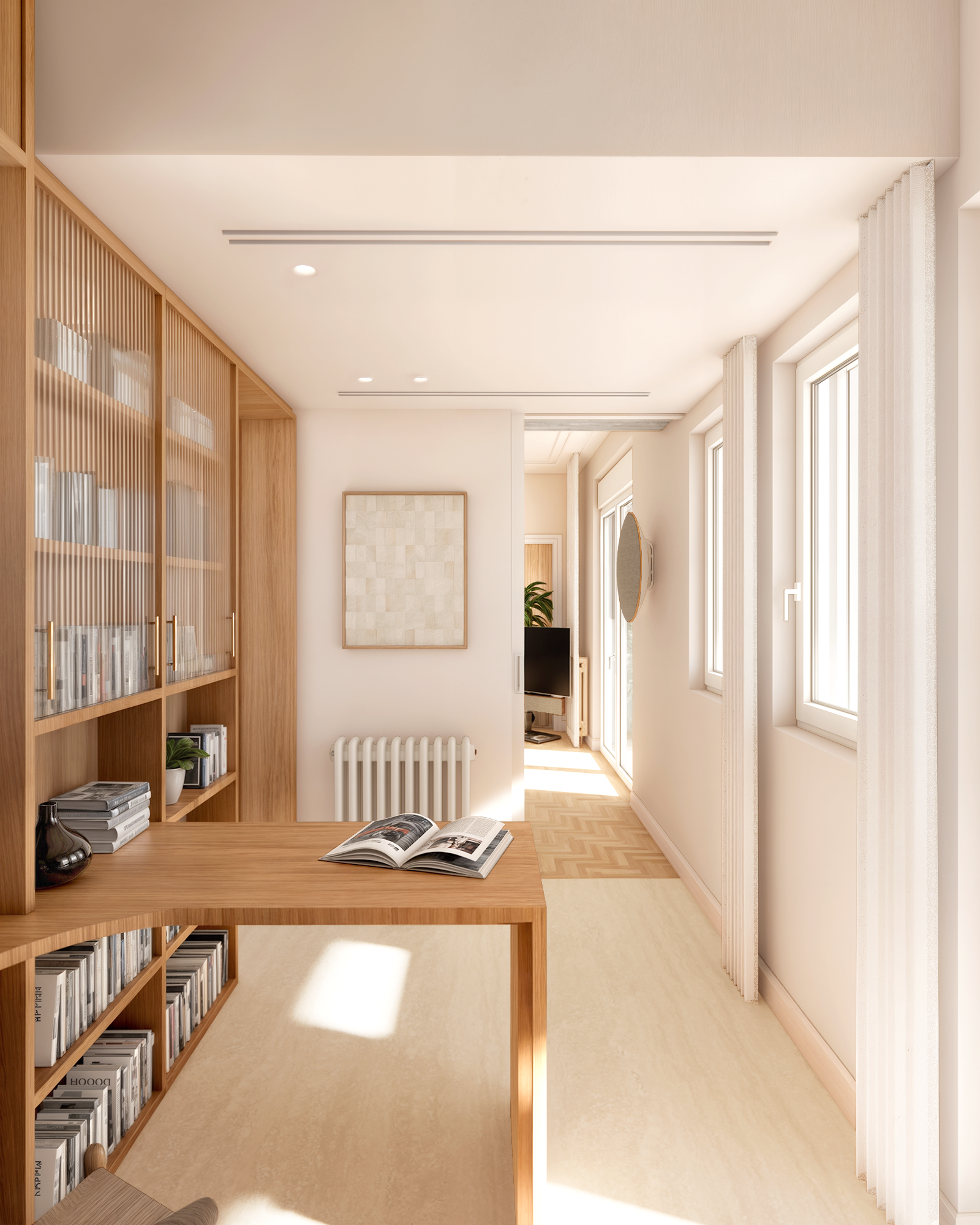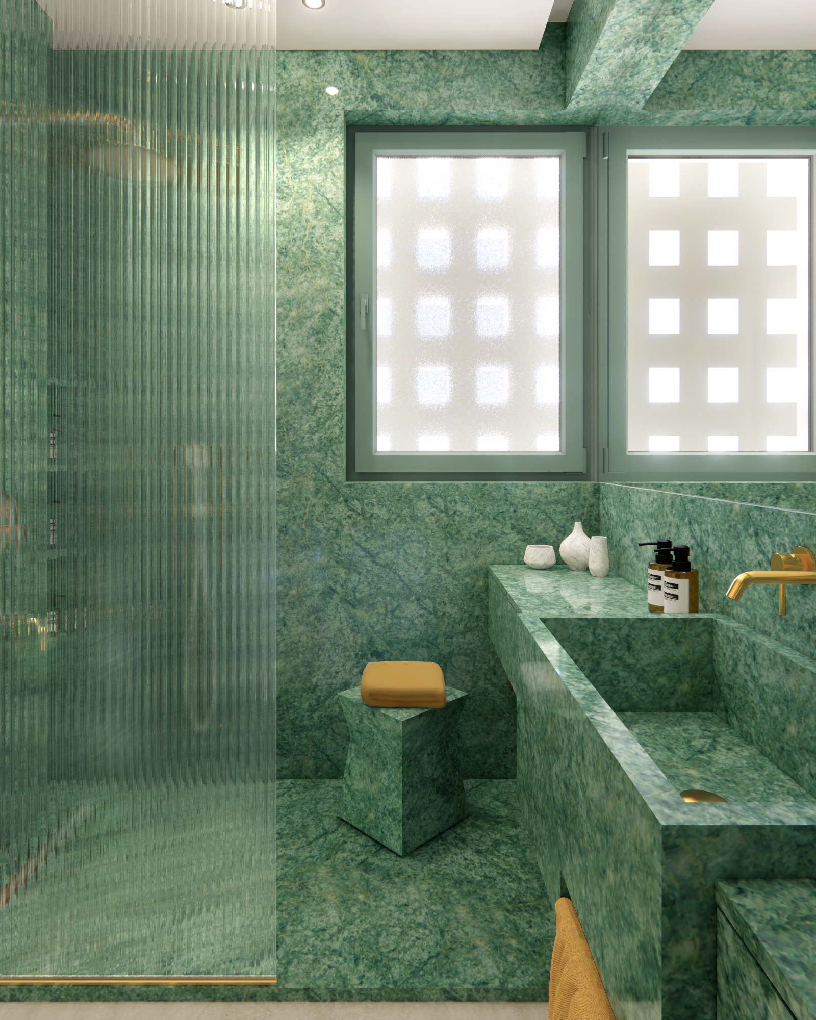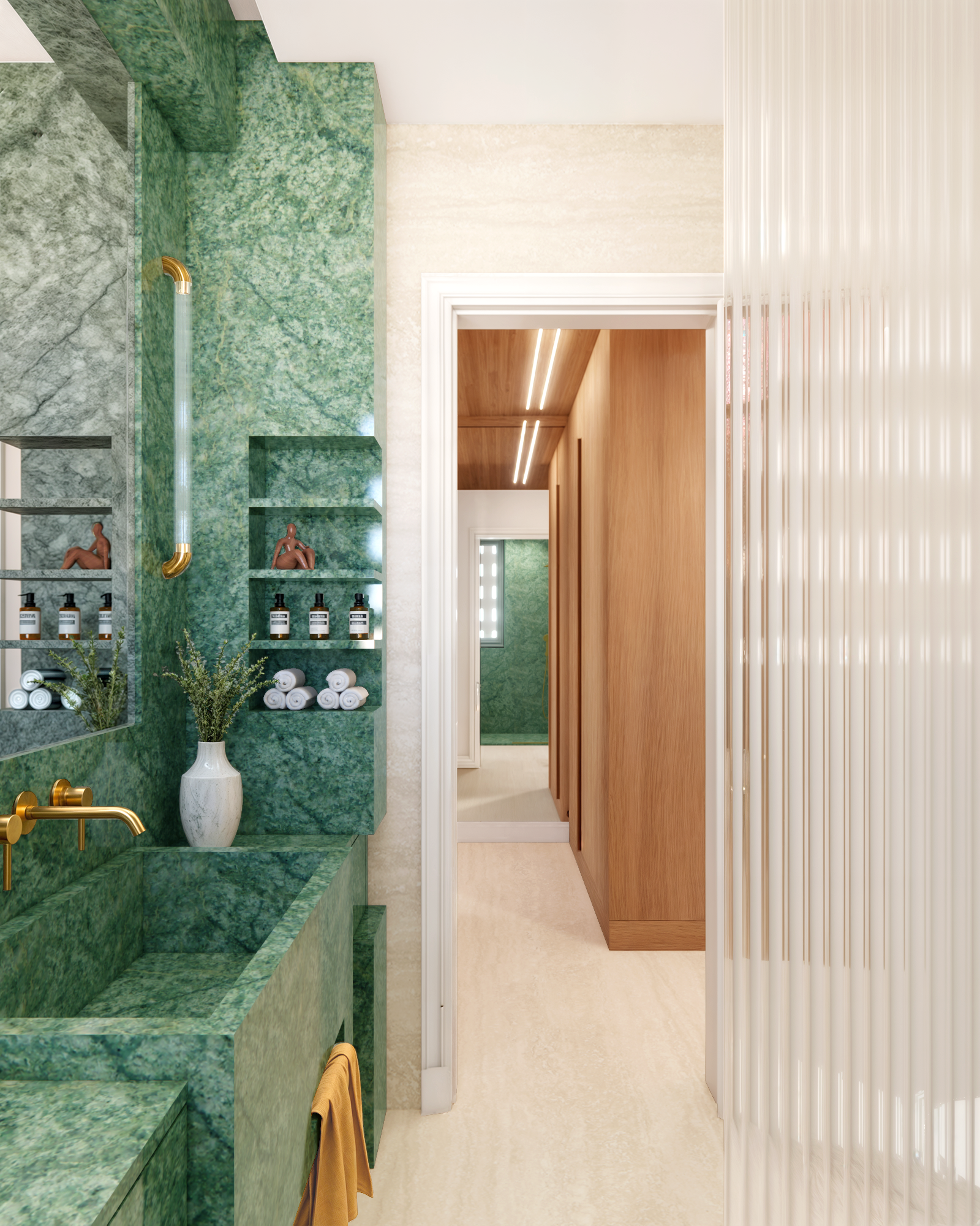 A precise material palette defines the interior: deep-green Verde Guatemala marble marks focal moments such as the kitchen counters, entrance, and main bathroom; Italian travertine lends warmth to circulation spaces, the study, and bathrooms; and bespoke oak joinery unites the apartment through cabinetry, wall cladding, and ceiling installations. Brushed golden details appear in subtle gestures, adding a crafted precision to points of touch.