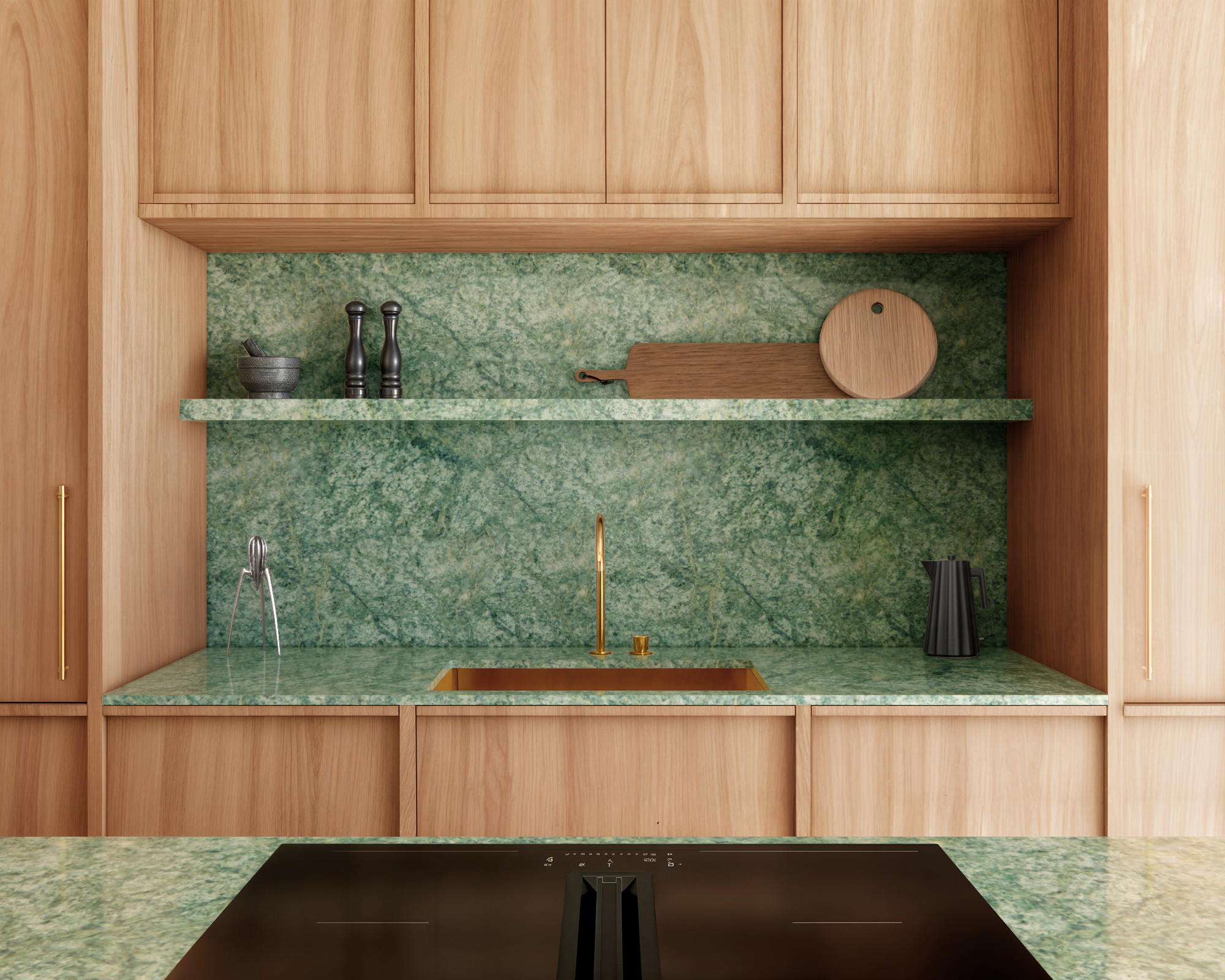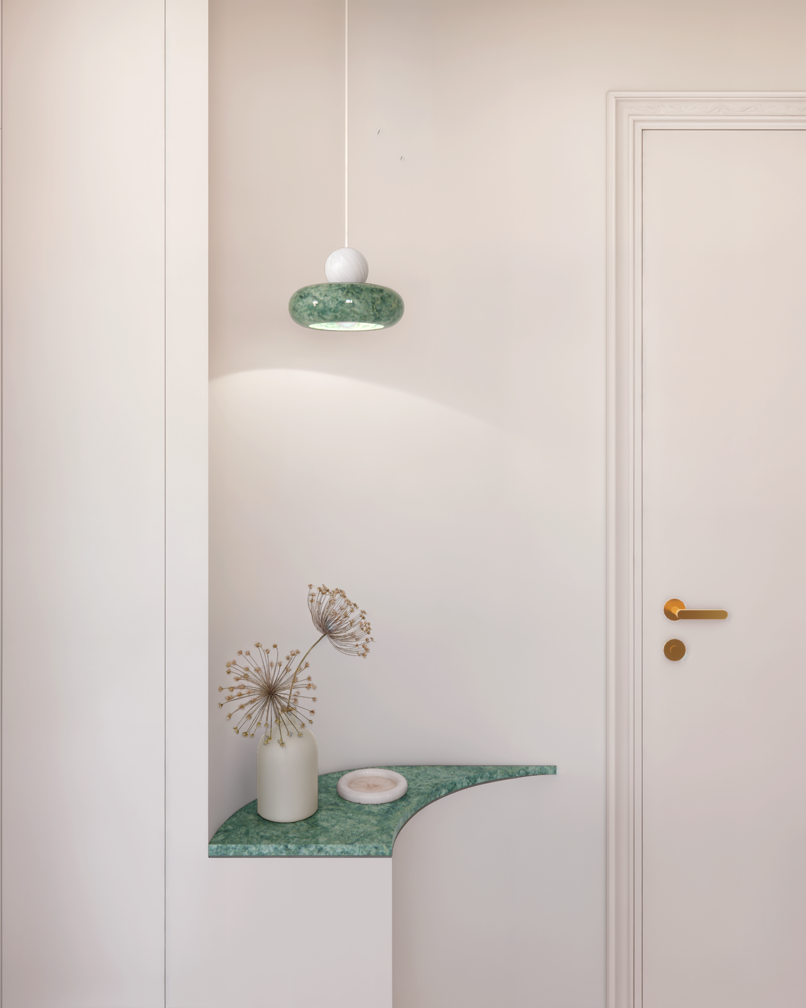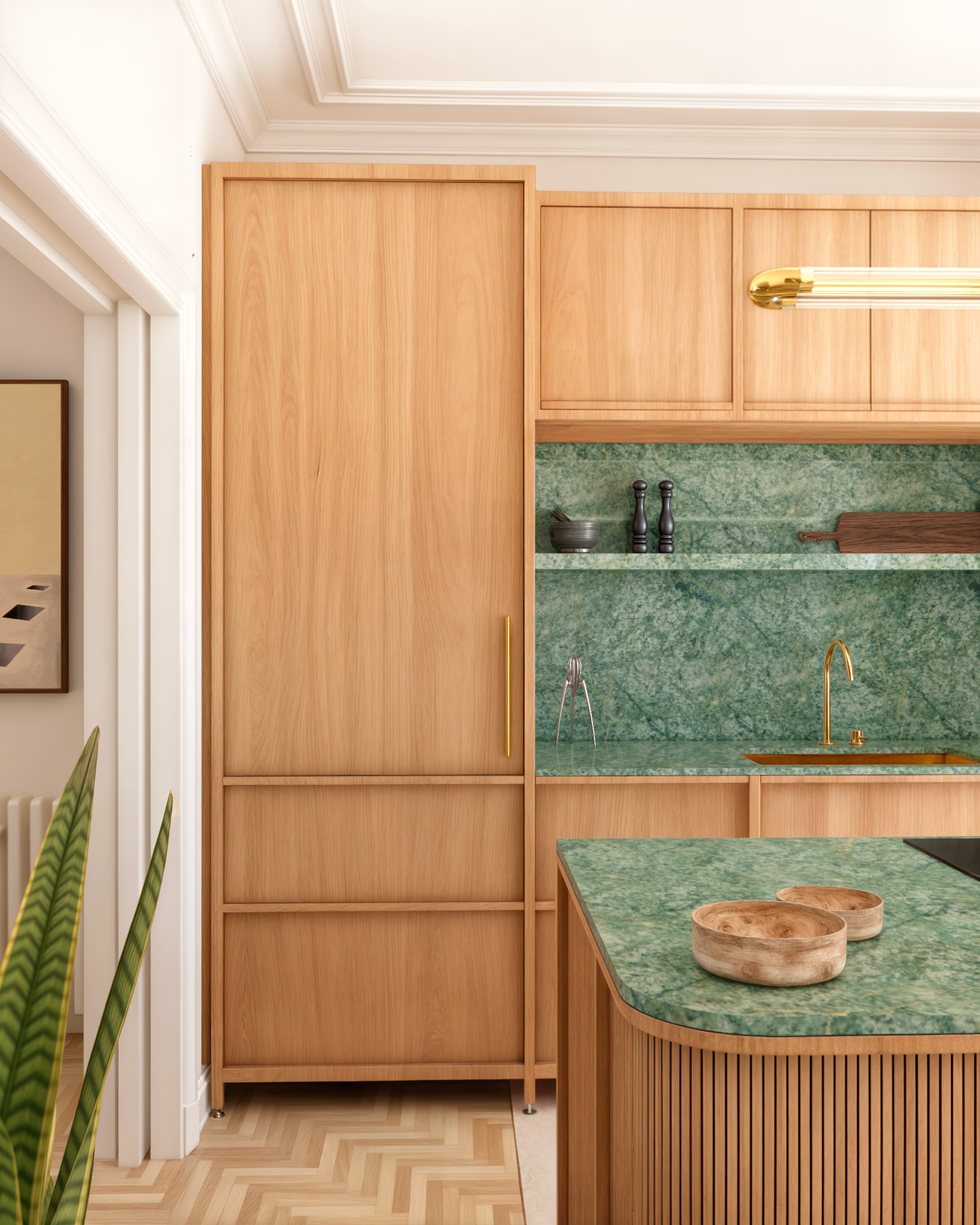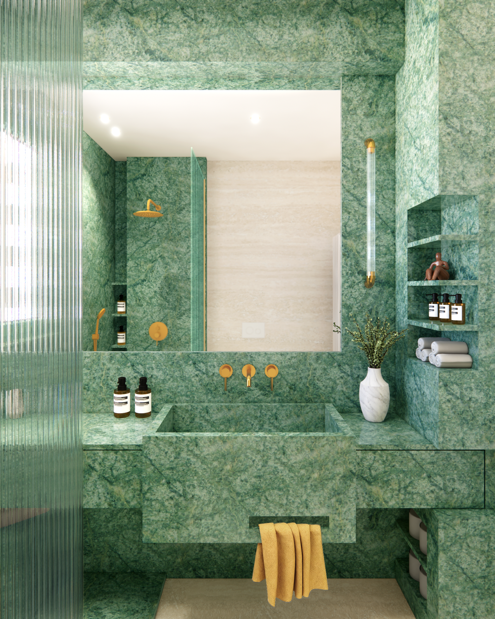 A precise material palette defines the interior: deep-green Verde Guatemala marble marks focal moments such as the kitchen counters, entrance, and main bathroom; Italian travertine lends warmth to circulation spaces, the study, and bathrooms; and bespoke oak joinery unites the apartment through cabinetry, wall cladding, and ceiling installations. Brushed golden details appear in subtle gestures, adding a crafted precision to points of touch.